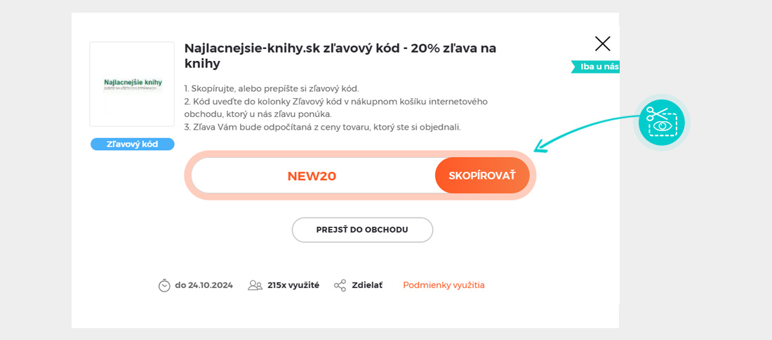 Skopírujte alebo si odpíšte zľavový kód a kliknite na tlačidlo „Prejsť do obchodu“. Následne budete presmerovaný priamo do e-shopu Najlacnejsie-knihy.sk.