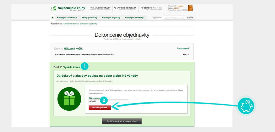 Vyberte si produkt v e-shope Najlacnejsie-knihy.sk, o ktorý máte záujem, stlačte tlačidlo „Do košíka“ a produkt sa automaticky vloží do nákupného košíka. Priamo v nákupnom košíku nájdete v druhom kroku objednávania v sekcii „Využite zľavu“ odkaz s názvom „Máte darčekový alebo zľavový poukaz?“. Tu do políčka s názvom „Kód poukazu“ vložte skopírovaný zľavový kód alebo ho ručne vpíšte a potvrďte tlačidlom „Uplatniť poukaz“.