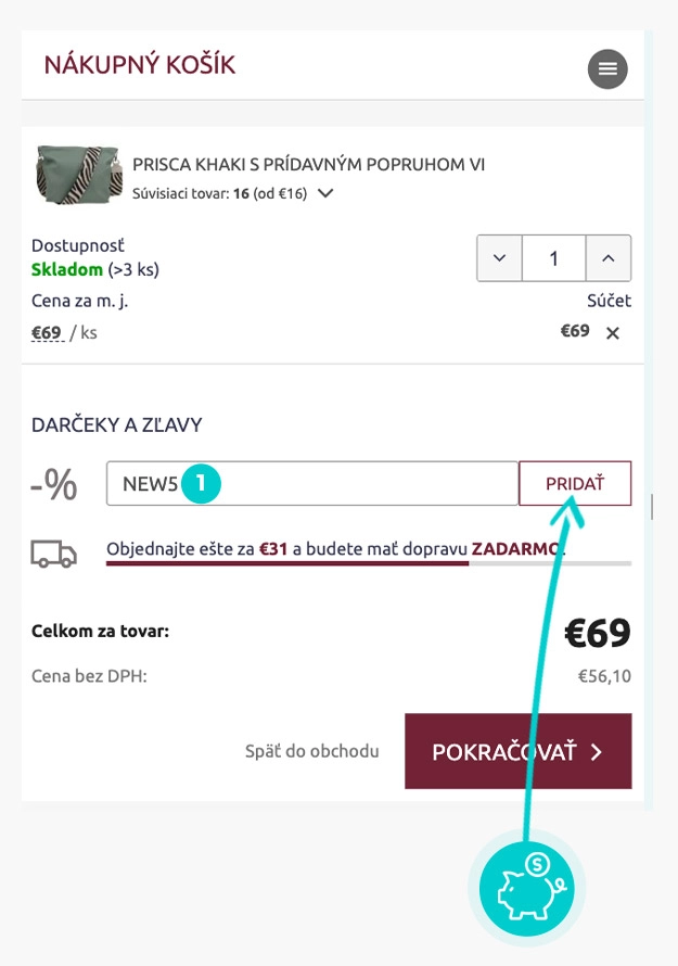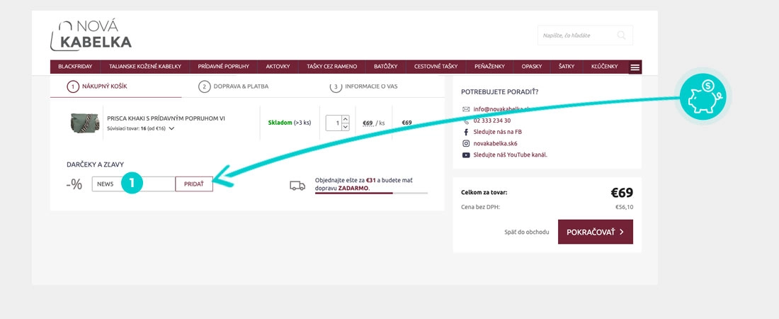 Vyberte si produkt v e-shope Novakabelka.sk, o ktorý máte záujem, stlačte tlačidlo „Do košíka“ a produkt sa automaticky vloží do nákupného košíka. Priamo v nákupnom košíku nájdete v prvom kroku objednávania pod zoznamom objednávaných produktov políčko „Darčeky a zľavy“. Tu vložte skopírovaný zľavový kód alebo ho ručne vpíšte a potvrďte tlačidlom „Pridať“.