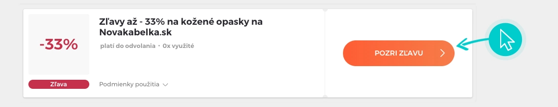 Vyberte si na našej stránke konkrétnu Nová Kabelka zľavu a kliknite na tlačidlo „Pozri zľavu“. Automaticky budete presmerovaný priamo na akciovú ponuku v internetovom obchode Novakabelka.sk, kde môžete produkt nakúpiť so zľavou.
