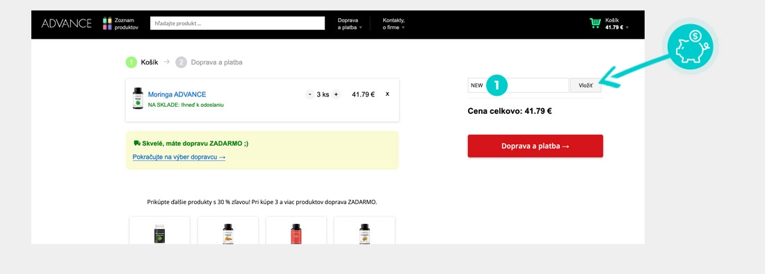 Vyberte si produkt v e-shope Nutraceutics.sk, o ktorý máte záujem, stlačte tlačidlo „Do košíka“ a produkt sa automaticky vloží do nákupného košíka. Priamo v nákupnom košíku nájdete v prvom kroku objednávania pod zoznamom objednávaných produktov vľavo dole políčko „Použít slevový kód“. Tu vložte skopírovaný zľavový kód alebo ho ručne vpíšte a potvrďte tlačidlom „Vložiť“.