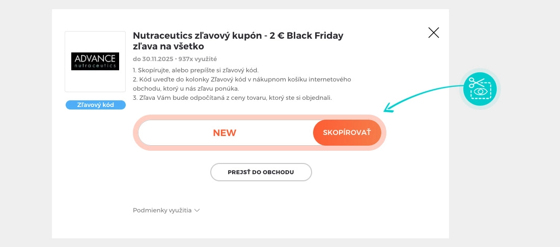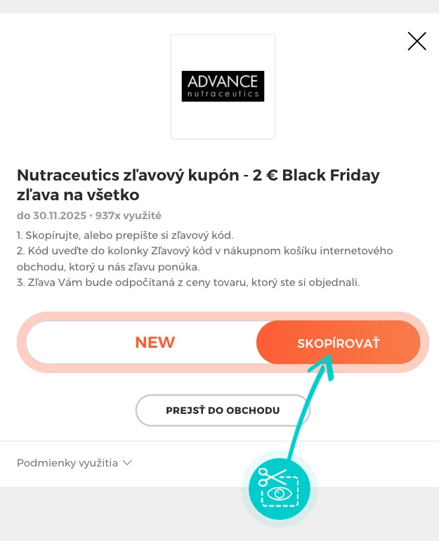 Skopírujte alebo si odpíšte zľavový kód a kliknite na tlačidlo „Prejsť do obchodu“. Následne budete presmerovaný priamo do e-shopu Nutraceutics.sk.