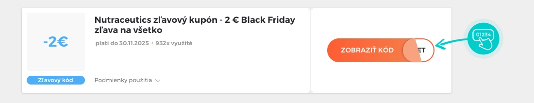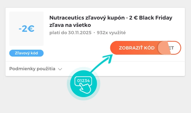 Vyberte si konkrétny zľavový kód na našej stránke, ktorý si chcete uplatniť v e-shope Nutraceutics.sk. Kliknite na oranžové tlačidlo „Zobraziť kód“.