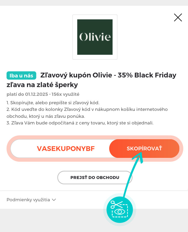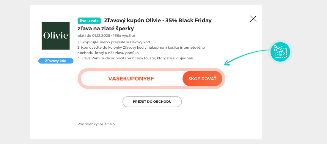 Skopírujte alebo si odpíšte zľavový kód a kliknite na tlačidlo „Prejsť do obchodu“. Následne budete presmerovaný priamo do eshopu Olivie.sk.