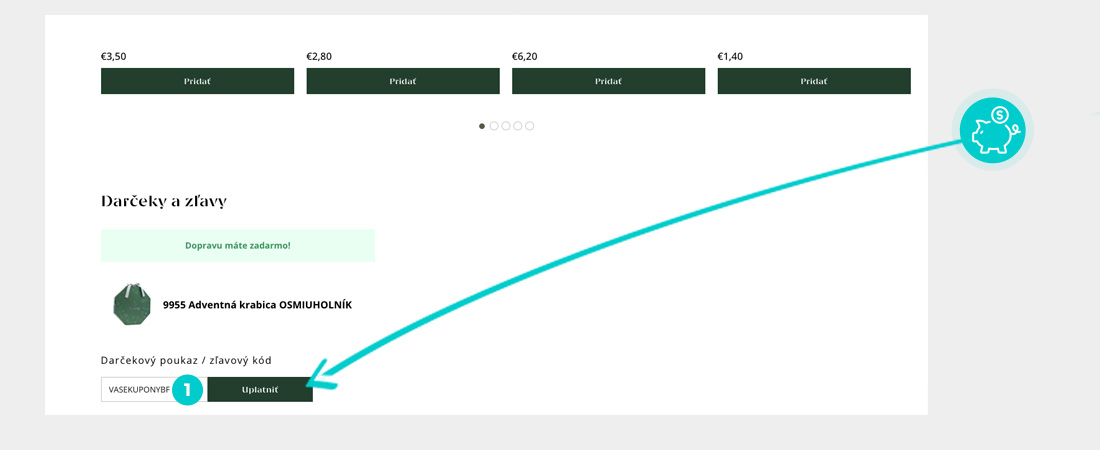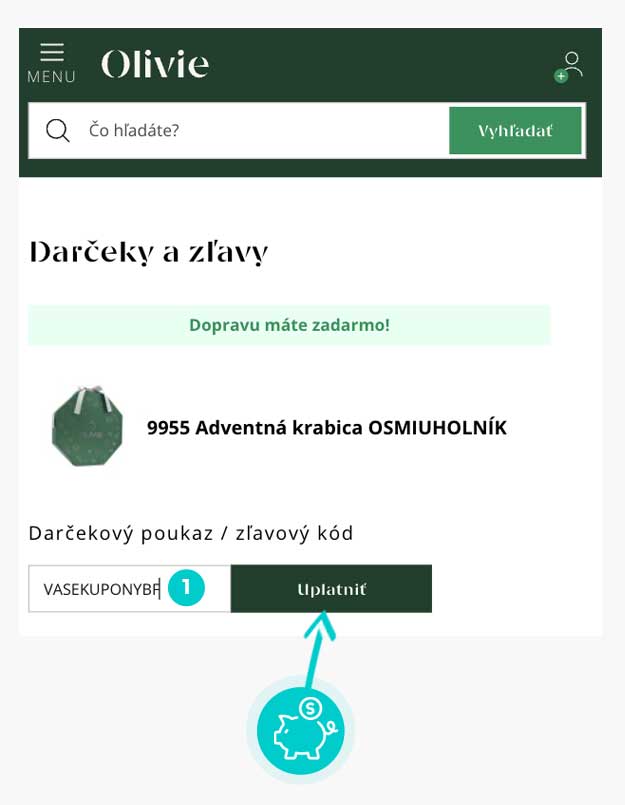 Vyberte si produkt v eshope Olivie.sk, o ktorý máte záujem, stlačte tlačidlo „Pridať do košíka“ a produkt sa automaticky vloží do nákupného košíka. Priamo v nákupnom košíku nájdete pod Vami vybraným produktom políčko „Darčekový poukaz / Zľavový kód“. Tu vložte skopírovaný zľavový kód alebo ho ručne vpíšte a potvrďte tlačidlom „Uplatniť“.