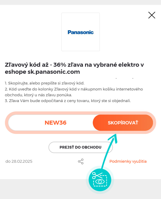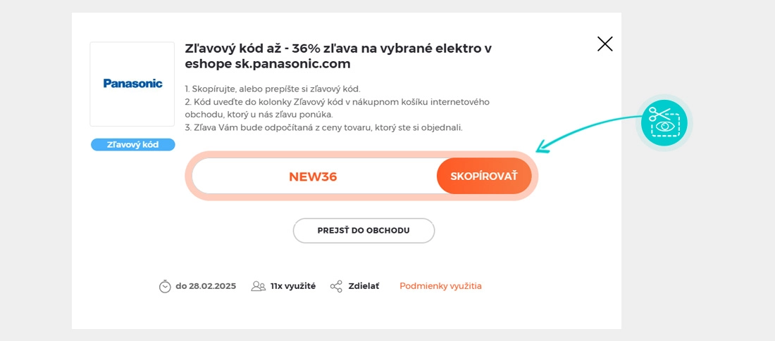 Skopírujte alebo si odpíšte zľavový kód a kliknite na tlačidlo „Prejsť do obchodu“. Následne budete presmerovaný priamo do eshopu sk.Panasonic.com.