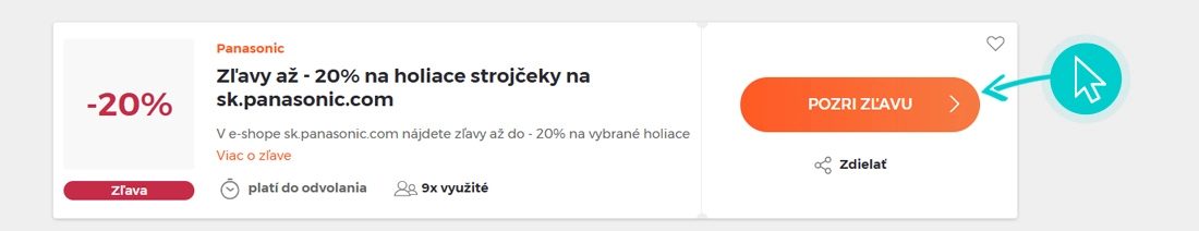 Vyberte si na našej stránke konkrétnu Panasonic zľavu a kliknite na tlačidlo „Pozri zľavu“. Automaticky budete presmerovaný priamo na akciovú ponuku v internetovom obchode sk.Panasonic.com, kde môžete produkt nakúpiť so zľavou.