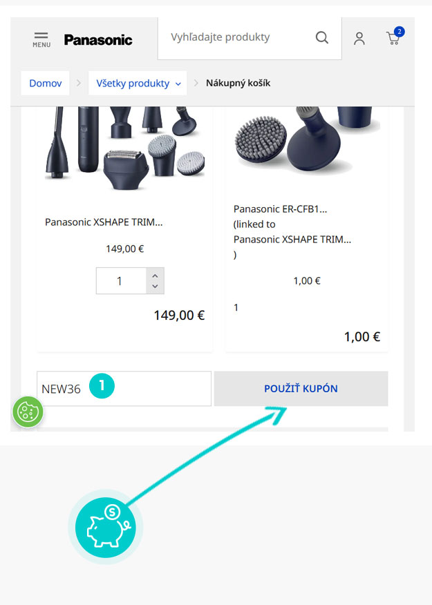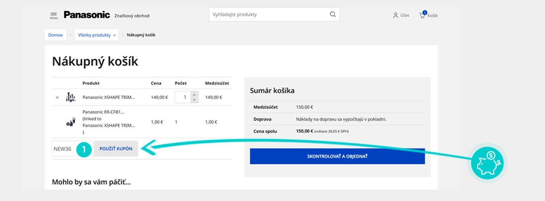 Vyberte si produkt v eshope sk.Panasonic.com, o ktorý máte záujem, stlačte tlačidlo „Do košíka“ a produkt sa automaticky vloží do nákupného košíka. Priamo v nákupnom košíku nájdete vpravo políčko „Kód kupónu“. Tu vložte skopírovaný zľavový kód alebo ho ručne vpíšte a potvrďte tlačidlom „Použiť kupón“.