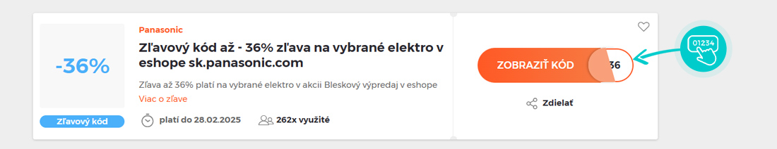 Vyberte si konkrétny zľavový kód na našej stránke, ktorý si chcete uplatniť v eshope sk.Panasonic.com. Kliknite na oranžové tlačidlo „Zobraziť kód“.
