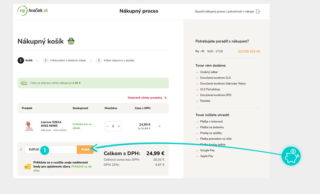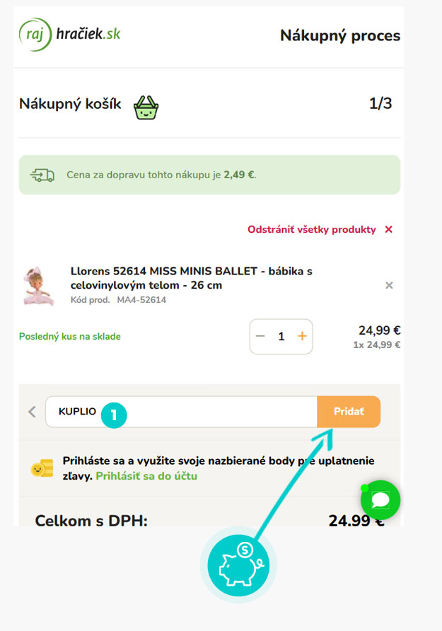 Vyberte si produkt v e-shope RajHraciek.sk, o ktorý máte záujem, stlačte tlačidlo „Do košíka“ a produkt sa automaticky vloží do nákupného košíka. Priamo v nákupnom košíku nájdete v prvom kroku objednávania pod zoznamom objednávaných produktov políčko „Zadať zľavový/darčekový kupón“. Tu vložte skopírovaný zľavový kód alebo ho ručne vpíšte a potvrďte tlačidlom „Pridať“.