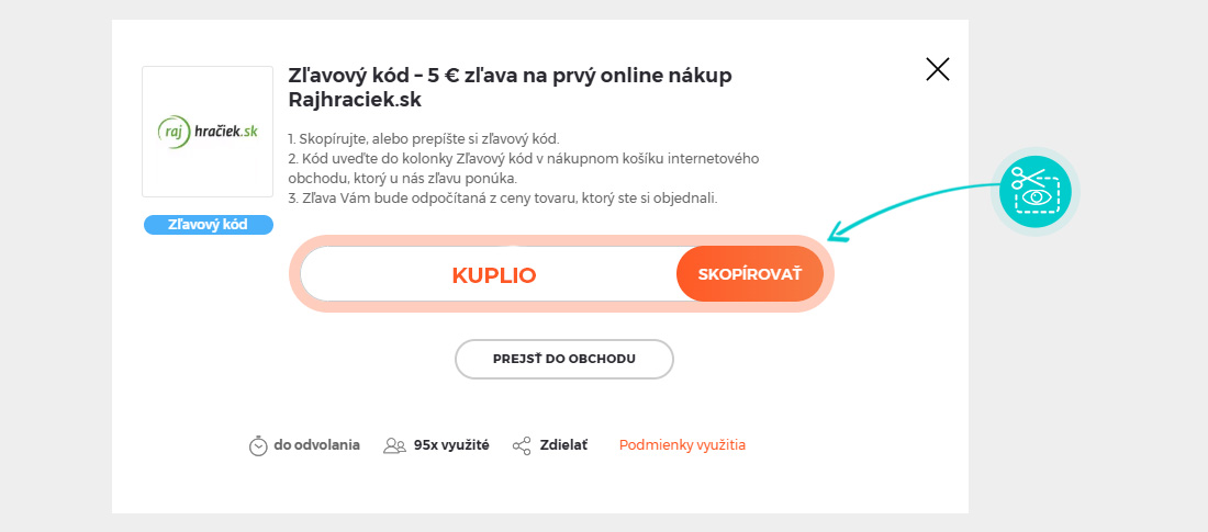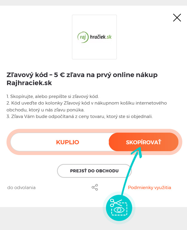 Skopírujte alebo si odpíšte zľavový kód a kliknite na tlačidlo „Prejsť do obchodu“. Následne budete presmerovaný priamo do e-shopu RajHraciek.sk.