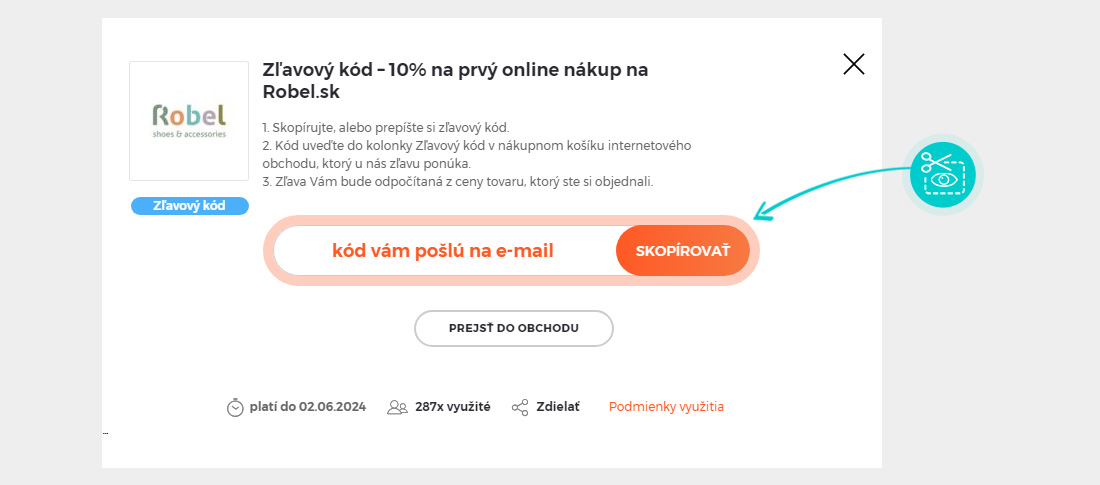 Skopírujte alebo si odpíšte zľavový kód a kliknite na tlačidlo „Prejsť do obchodu“. Následne budete presmerovaný priamo do eshopu Robel.sk.