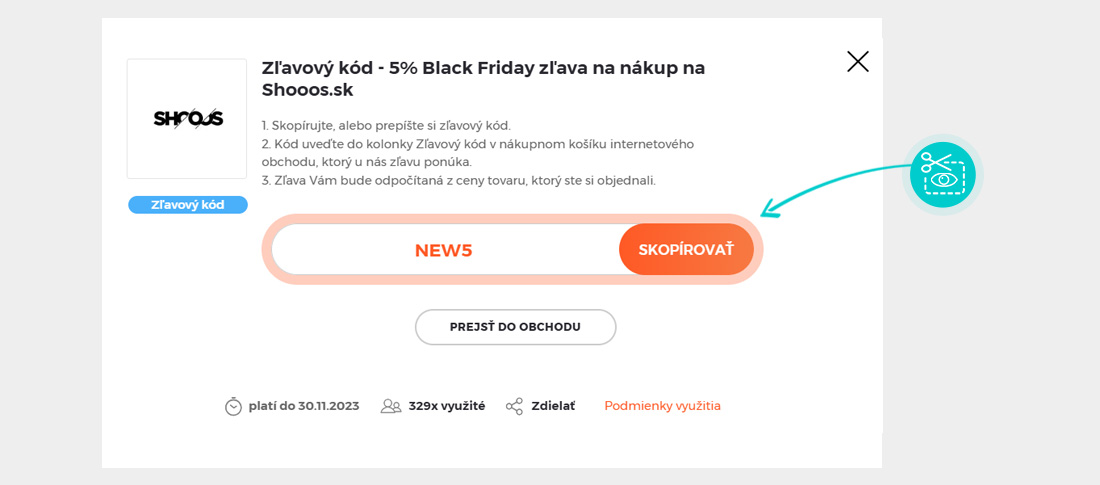 Skopírujte alebo si odpíšte zľavový kód a kliknite na tlačidlo „Prejsť do obchodu“. Následne budete presmerovaný priamo do e-shopu Shooos.sk.