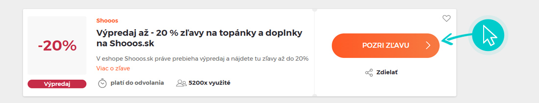Vyberte si na našej stránke konkrétnu Shooos zľavu a kliknite na tlačidlo „Pozri zľavu“. Automaticky budete presmerovaný priamo na akciovú ponuku v internetovom obchode Shooos.sk, kde môžete produkt nakúpiť so zľavou.