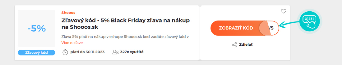 Vyberte si konkrétny zľavový kód na našej stránke, ktorý si chcete uplatniť v e-shope Shooos.sk. Kliknite na oranžové tlačidlo „Zobraziť kód“.