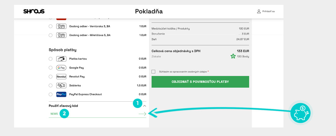Vyberte si produkt v e-shope Shooos.sk, o ktorý máte záujem, stlačte tlačidlo „Do košíka“ a produkt sa automaticky vloží do nákupného košíka. Priamo v nákupnom košíku nájdete vpravo v časti "Zhrnutie" políčko „Kód kupónu“. Tu vložte skopírovaný zľavový kód alebo ho ručne vpíšte a potvrďte zelenou šípkou doprava.