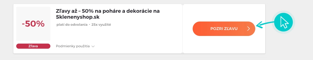 Vyberte si na našej stránke konkrétnu Sklenený shop SK zľavu a kliknite na tlačidlo „Pozri zľavu“. Automaticky budete presmerovaný priamo na akciovú ponuku v internetovom obchode Sklenenyshop.sk, kde môžete produkt nakúpiť so zľavou.