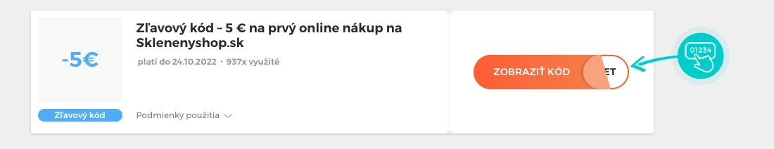 Vyberte si konkrétny zľavový kód na našej stránke, ktorý si chcete uplatniť v e-shope Sklenenyshop.sk. Kliknite na oranžové tlačidlo „Zobraziť kód“.