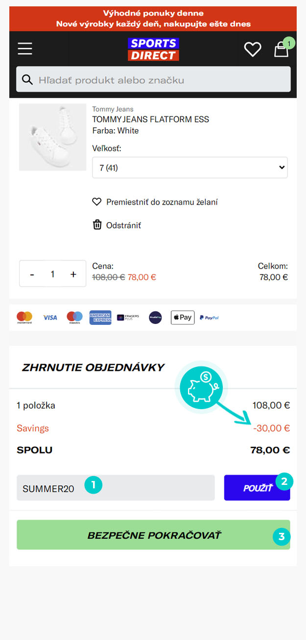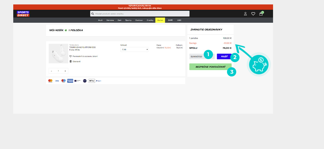Vyberte si produkt v eshope Sportsdirect.com, o ktorý máte záujem, stlačte tlačidlo „Do košíka“ a produkt sa automaticky vloží do nákupného košíka. Priamo v nákupnom košíku nájdete vpravo v časti "Zhrnutie objednávky" políčko „Zadať zľavový kód“. Tu vložte skopírovaný zľavový kód alebo ho ručne vpíšte a potvrďte tlačidlom „Použiť“.
