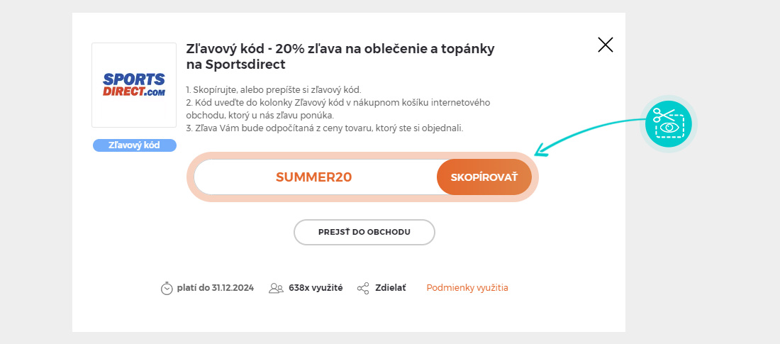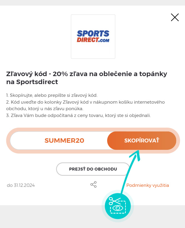 Skopírujte alebo si odpíšte zľavový kód a kliknite na tlačidlo „Prejsť do obchodu“. Následne budete presmerovaný priamo do eshopu Sportsdirect.com.