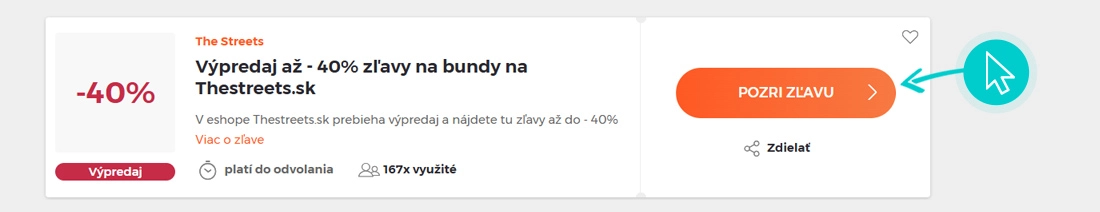 Vyberte si na našej stránke konkrétnu The Streets zľavu a kliknite na tlačidlo „Pozri zľavu“. Automaticky budete presmerovaný priamo na akciovú ponuku v internetovom obchode Thestreets.sk, kde môžete produkt nakúpiť so zľavou.