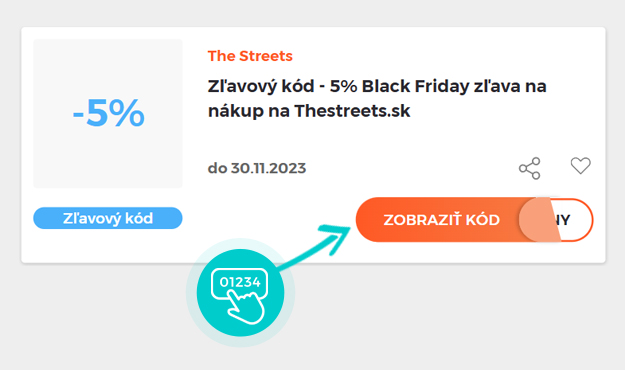Vyberte si konkrétny zľavový kód na našej stránke, ktorý si chcete uplatniť v e-shope Thestreets.sk. Kliknite na oranžové tlačidlo „Zobraziť kód“.