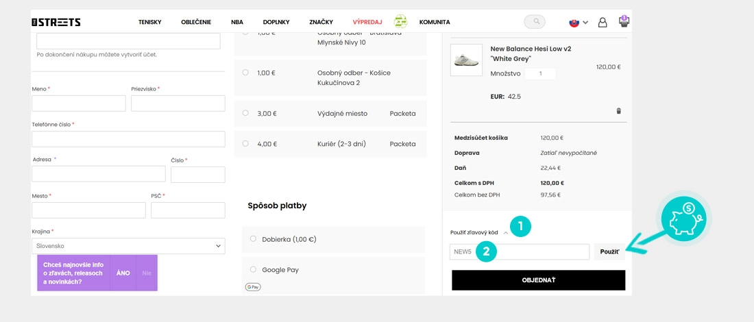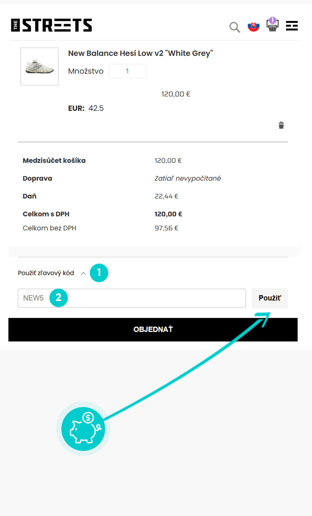 Vyberte si produkt v e-shope Thestreets.sk, o ktorý máte záujem, stlačte tlačidlo „Do košíka“ a produkt sa automaticky vloží do nákupného košíka. Priamo v nákupnom košíku nájdete vpravo v časti "Zhrnutie" políčko „Použiť zľavový kód“. Tu vložte skopírovaný zľavový kód alebo ho ručne vpíšte a potvrďte tlačidlom „Použiť“.