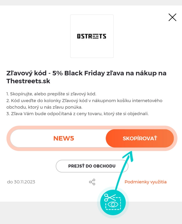 Skopírujte alebo si odpíšte zľavový kód a kliknite na tlačidlo „Prejsť do obchodu“. Následne budete presmerovaný priamo do e-shopu Thestreets.sk.