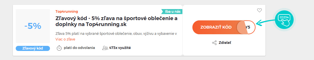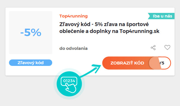 Vyberte si konkrétny zľavový kód na našej stránke, ktorý si chcete uplatniť v e-shope Top4running.sk. Kliknite na oranžové tlačidlo „Zobraziť kód“.
