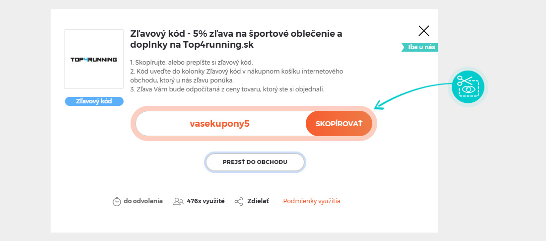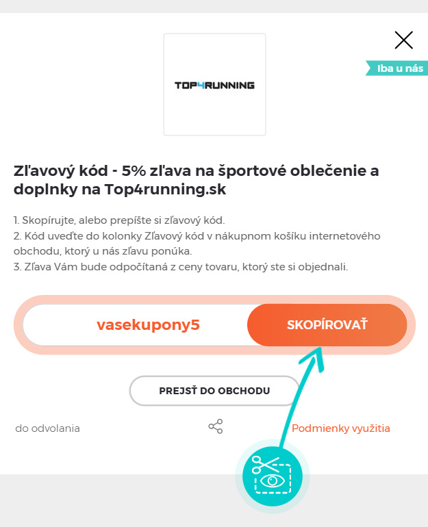 Skopírujte alebo si odpíšte zľavový kód a kliknite na tlačidlo „Prejsť do obchodu“. Následne budete presmerovaný priamo do e-shopu Top4running.sk.