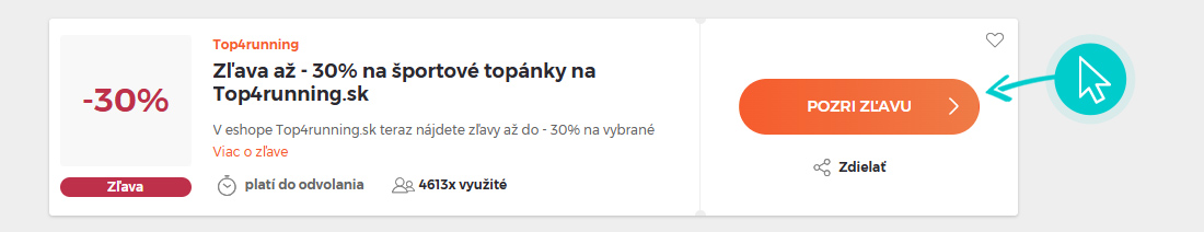 Vyberte si na našej stránke konkrétnu Top4running zľavu a kliknite na tlačidlo „Pozri zľavu“. Automaticky budete presmerovaný priamo na akciovú ponuku v internetovom obchode Top4running.sk, kde môžete produkt nakúpiť so zľavou.