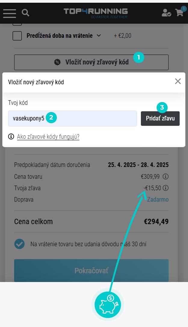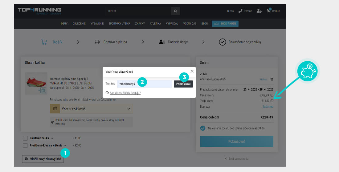 Vyberte si produkt v e-shope Top4running.sk, o ktorý máte záujem, stlačte tlačidlo „Do košíka“ a produkt sa automaticky vloží do nákupného košíka. Priamo v nákupnom košíku nájdete v prvom kroku objednávania pod zoznamom objednávaných produktov vľavo dole políčko „Vložiť nový zľavový kód“. Pre uplatnenie kódu sa prihláste do svojho zákazníckeho účtu a následne vložte skopírovaný zľavový kód alebo ho ručne vpíšte a potvrďte tlačidlom „Pridať zľavu“.