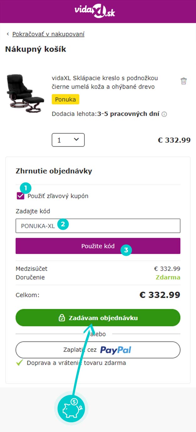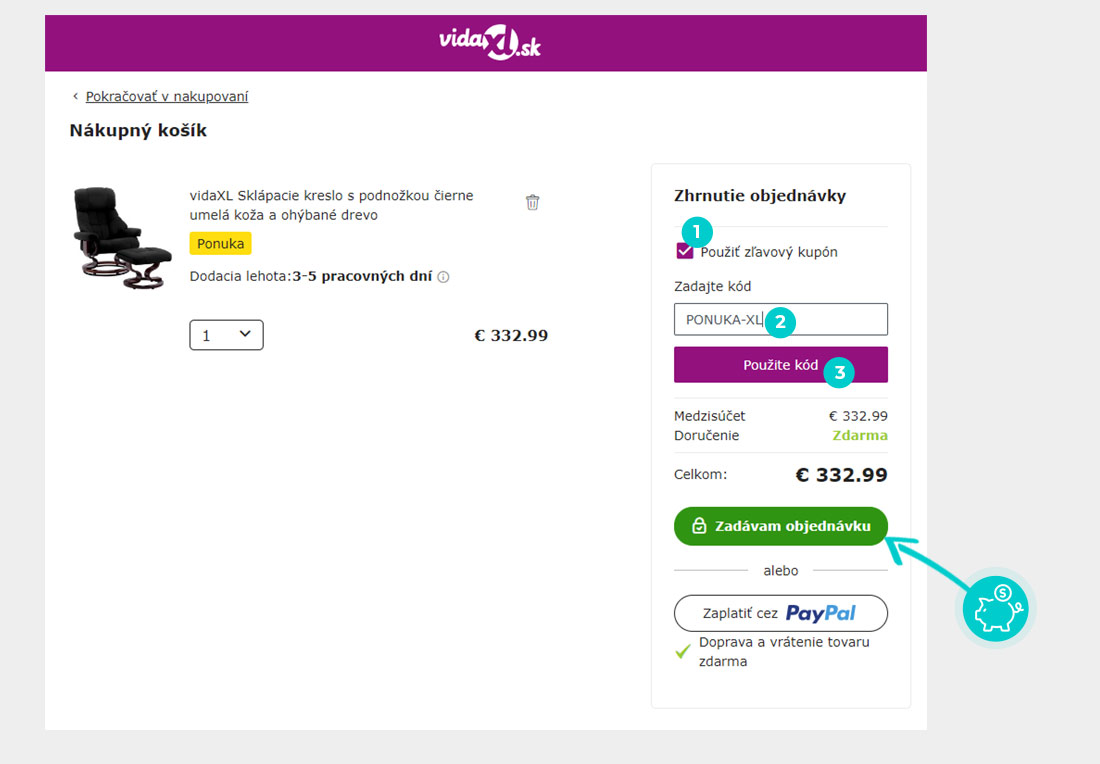 Vyberte si produkt v eshope VidaXL.sk., o ktorý máte záujem, stlačte tlačidlo „Do košíka“ a produkt sa automaticky vloží do nákupného košíka. Priamo v nákupnom košíku nájdete vpravo v časti "Zhrnutie objednávky" políčko „Zadajte kód“. Tu vložte skopírovaný zľavový kód alebo ho ručne vpíšte a potvrďte tlačidlom „Použite kód“.