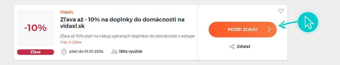 Vyberte si na našej stránke konkrétnu VidaXL zľavu a kliknite na tlačidlo „Pozri zľavu“. Automaticky budete presmerovaný priamo na akciovú ponuku v internetovom obchode VidaXL.sk, kde môžete produkt nakúpiť so zľavou.