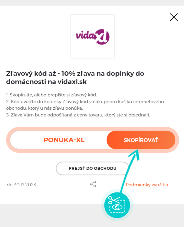Skopírujte alebo si odpíšte zľavový kód a kliknite na tlačidlo „Prejsť do obchodu“. Následne budete presmerovaný priamo do eshopu VidaXL.sk.