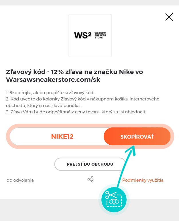 Skopírujte alebo si odpíšte zľavový kód a kliknite na tlačidlo „Prejsť do obchodu“. Následne budete presmerovaný priamo do e-shopu Warsawsneakerstore.com/sk.