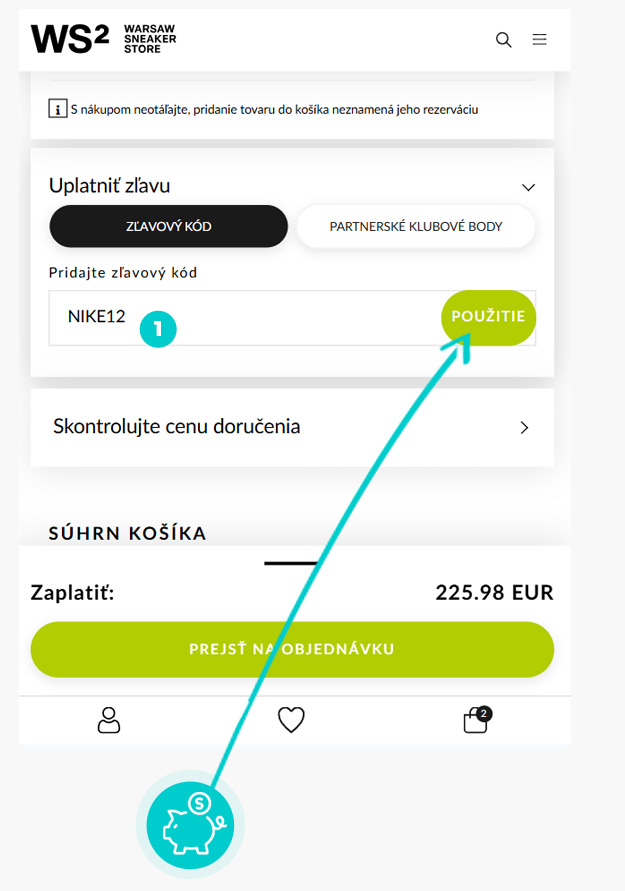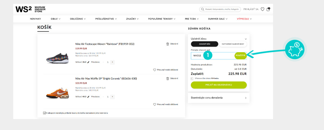 Vyberte si produkt v e-shope Warsawsneakerstore.com/sk, o ktorý máte záujem, stlačte tlačidlo „Pridať do košíka“ a produkt sa automaticky vloží do nákupného košíka. Priamo v nákupnom košíku nájdete v časti „Súhrn košíka“ políčko „Uplatniť zľavu“. Kliknite na ňu a vložte skopírovaný zľavový kód alebo ho ručne vpíšte a potvrďte tlačidlom „Použitie“.