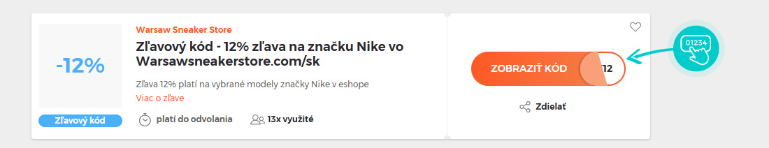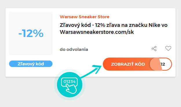 Vyberte si konkrétny zľavový kód na našej stránke, ktorý si chcete uplatniť v e-shope Warsawsneakerstore.com/sk. Kliknite na oranžové tlačidlo „Zobraziť kód“.